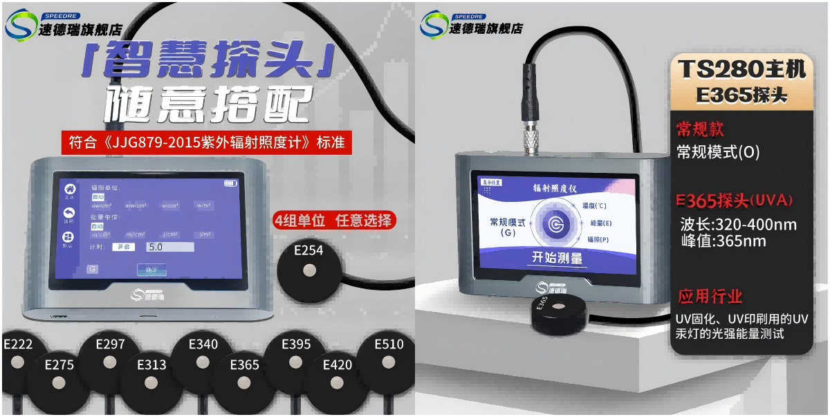 速德瑞深耕365nm紫外测量领域,推出的TS280系列等专业仪器,精准匹配这一波长的核心优势——其探测器经严格光谱与角度特性校正,中心波长365nm、测量精度达±5%,可快速捕捉0.01mW/cm²级的微弱信号,完美承接高灵敏度检测需求;同时探头与主机分离的灵活设计、-20℃至100℃的宽温工作范围,搭配无损伤测量算法,在半导体光刻、文物鉴定、生物医疗等场景中,既能精准采集辐照度与能量数据,又不会对样品造成额外负担。更支持数据实时记录、超限报警功能,可无缝对接工业产线与实验室系统,让365nm紫外光的“高灵敏度”与“无损保护”优势落地为可量化、可追溯的检测方案,成为高端制造领域的可靠技术伙伴。